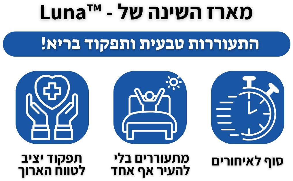 אחרי מאות בדיקות, נסיונות ושיחות עם מומחי שינה פיתחנו את ™Luna כדי לתת לאנשים את מה שחסר להם הכי הרבה בבוקר