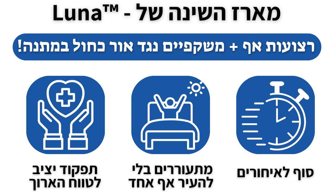 אחרי מאות בדיקות, נסיונות ושיחות עם מומחי שינה פיתחנו את ™Luna כדי לתת לאנשים את מה שחסר להם הכי הרבה בבוקר